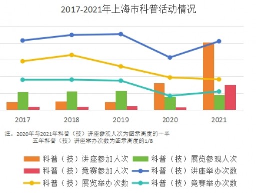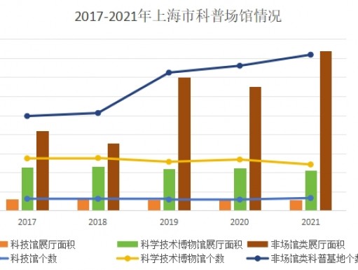 2021年,上海市共有科普场馆177个,其中科技馆33个,科学技术博物馆119个,青少年科技馆(站)25个。科技馆建筑面积合计18.35万平方米,展厅面积11.66万平方米。科学技术博物馆建筑面积合计86.79万平方米,展厅面积41.78万平方米。青少年科技馆(站)建筑面积合计14.09万平方米,展厅面积2.49万平方米。2021年是新冠疫情的第二年,疫情影响有所削弱,但不断肆虐的疫情仍对各科普场馆产生较大影响。2021年科技馆累计参观人次308.22万人次,科学技术博物馆累计参观人次1188.24万人次,青少年科技馆(站)累计参观人次166.68万人次,科普场馆仍以科学技术博物馆为主要人流量来源。全年科普场馆累计参观人次2905万人次,较2019年的2398万人次有所回升,但仍未恢复至疫情前2019年的3917万人次。