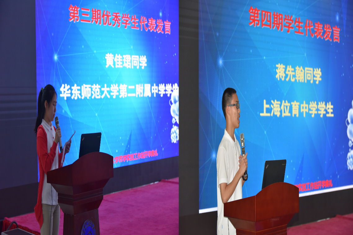 随后,第三期优秀学生代表黄佳珺同学总结了自己参与药学实践工作站创新实践项目的经验,分享了自己在课程中的收获心得。来自位育中学的蒋先翰同学代表新学员向药学实践工作站提供的药学科普知识表示感谢,结合实际生活与所学知识阐述了对药物研究与发展方向的理解,也表达了对此次科学创新实践项目的期待。